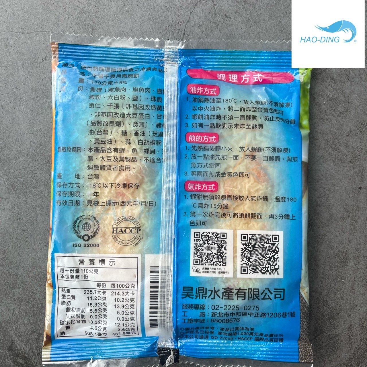 ●成份:魚漿(鯊魚肉、旗魚肉、樹薯澱粉、太白粉、鹽)、珠貝、蝦仁、千張(非基因改造黃豆、非基因改造大豆蛋白、甘油(品質改良劑)、食鹽)、豬板油(台灣)、糖、香油(芝麻油、黃豆油)、蒜、白胡椒粉。